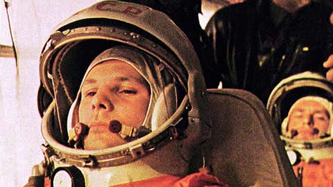 Yuri Gagarin, the pilot of the Vostok 1, is on the bus on the way to the start. The cosmonaut driving Gagarin is German Titov, the back again-u pilot who turned pilot of Vostok 2.
